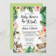 Celebra la llegada de tu precioso bebé con esta elegante invitación de moda y bonito "Baby Shower by Mail" que incluye bonitos animales de safari de la jungla con máscaras en hermosas flores tropicales de color agua con fondo de hojas de selva verde. Esta plantilla es perfecta para aquellos que viven a una distancia larga de sus seres queridos, pero aún así desean hacer especial para que la madre o los padres sean al brindarles amor y regalos. Todos los textos están predispuestos para que puedas personalizarlos fácil y rápidamente con los detalles de tu ducha de bebé.