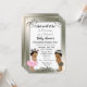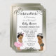 Invitaciones a la ducha de bebé del Principito o la Princesa. Un niño afroamericano con pañales del ejército y una niña pequeña con una imagen de bebé de tutu rosado. Fondo plateado.