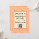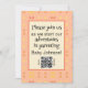 Celebra tus aventuras en la crianza de tu recién nacido con el color más moderno de 2024, el melocotón, en un diseño retro de un solo lado con un moderno código QR para que tus seres queridos obtengan más detalles sobre tu evento. El color de la melocotón es moderno en 2024, aunque también es alentador, y este diseño utiliza ese color de tres formas, en dos tonalidades diferentes en el diseño y como un color de fondo complementario. Es una divertida versión de patrón retro geométrico repetitivo de baldosas de cuatro esquinas y diseño amarillo, con el diseño a la cabeza del producto para que uno piense más allá de las limitaciones del espacio. ¿No es así para el melocotón? ¡Puedes cambiar el color de fondo a lo que quieras! Seguiremos de moda con los elementos de diseño de melocotón y amarillo, pero no siguiendo a la multitud sin pensar. Este diseño relajante funciona bien en una sala de estar, un dormitorio, un salón al aire libre o una habitación para bebés o niños. Descripción del diseño: El diseño básico basado en un cuadrado dentro de otro, aunque no hay líneas que conecten los cuadrados, tu cerebro hace que eso funcione para ti. El cuadrado interior es amarillo más oscuro en las cuatro esquinas, no hay ningún diseño que conecte las esquinas. En el exterior hay otro cuadrado, de color amarillo más claro en las cuatro esquinas, con dos cucharas de melocotón en cada esquina. Hay dos melocotones, uno más rojo y el otro más amarillo, y los colores coincidentes están uno frente al otro. Las secciones central y de esquina están enlosadas a través del patrón, lo que crea cuadrados de color único adicionales. Descripción del texto: todo el texto es una plantilla para que pueda cambiar a lo que desee. También puede personalizar de todas las fuentes. El texto principal dice: "¡Por favor, únete a nosotros mientras iniciamos nuestras aventuras para criar a Baby Johnson!" A continuación se muestra un código QR que puede personalizar con su registro de bebés o su sitio web. Hay un texto de plantilla para decirle a la gente qué hay en el código QR, con texto en ambos lados. El reverso tiene el diseño subyacente pero no texto.