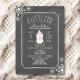 Invitación a una ducha de bebé de invierno con el ilustracion de un oso polar sobre un fondo inspirado en un pizarrón con copos de nieve en la parte superior izquierda y abajo a la derecha. El oso polar lleva un gorra rosado y una bufanda. Personalice el texto en blanco.