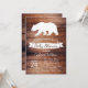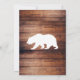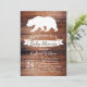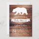 Rústica invitación a la ducha de bebé con un cálido ambiente rústico de tablas de madera de granero y silueta de oso. En la parte trasera hay otra silueta de oso.