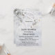 Invitación a una ducha de bebé, soñadora y mágica, neutral en cuanto a género, con un oso de peluche en una brillante escena nevada viendo los adornos de copos de nieve de plata y una rama de árbol cubierta de nieve.