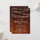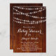 Guión de lazo brillante y luces de cuerda brillantes decoran esta invitación a la ducha de bebé con un fondo de madera, lo que la hace perfecta para la ducha de bebé rústica, rural, occidental o tradicional, acentuada con luces de cuerda.