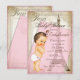 Invitación de baby shower vintage de París con una adorable bebé vestida con un pañal rosa y un lazo sobre un bonito fondo vintage de la torre Eiffel. Puedes personalizar fácilmente este baby shower de París para tu evento añadiendo tus detalles en el estilo de letra y color, y redacción de tu elección.