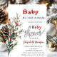 Rama de invierno de color agua verde con acentos de bayas rojas.Estas invitaciones a la ducha de bebé se personalizan fácilmente para tu evento simplemente añadiendo tus detalles.