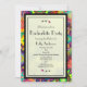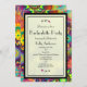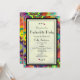 Una ráfaga de formas de flores art deco y ruedas giratorias en muchos colores vibrantes y emocionantes. Muchas formas y patrones diferentes con pétalos y círculos y más se superponen en este patrón de estilo ornamental Art Nouveau. Una variedad de colores brillantes y audaces le da a este patrón emoción y diversión que está rebosando de vida. Los colores dominantes son el verde intenso de la cal, el naranja de la explosión del sol, el azul turquesa, la mandarina y el rojo burdeos. En el centro de la invitación se coloca un cuadro negro con un centro blanco y negro cremoso, con un largo ilustracion de rosa rojo de tallo colocado en la parte superior e inferior del cuadro.