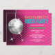 © Socialite Designs Inc. Celebra la futura fiesta de la soltera enviando estas divertidas invitaciones de fiesta de discoteca rosa y plateada. Personalizar fácilmente el texto del evento reemplazando el texto de la plantilla. El diseño incorpora una bola disco de plata, fondo rosa con reflejos y estallidos que se pueden mover y cambiar de tamaño. El texto está hecho para que parezca luces de neón.