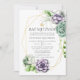 Invitación de batz mitzvah de boda con suculentas de moda con marco geométrico dorado y reverso de lavado de acuarela verde grisáceo.