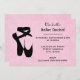 Invitación a un recital de baile de ballet. Un ilustracion de silueta de un par de zapatos de ballet negros / zapatillas de estar parados en los bailarines de ballet clásico y contemporáneo posan en la punta de los dedos de los pies, conocido como en pointe. El fondo es rosa con pequeños puntos de polka blancos. Personalizar con los detalles del evento.