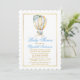 Moderna Elegante acuarela Azul Floral Blanco Balón de aire caliente Invitación Baby Shower. Incluye hermosos rosas azul acuático, flores blancas y vegetación botánica. Texto dorado y azul. Marco dorado.