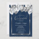 Elegante marco plateado, globos y confeti sobre fondo azul marino.