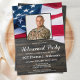 Invitaciones de Jubilación Militar de la Bandera Americana - Celebre años de servicio dedicado, e invite a amigos y familiares a su fiesta de jubilación militar con esta Invitación de Jubilación con Bandera Americana - diseño de bandera americana en madera rústica. Esta invitación de jubilación militar también es perfecta para invitaciones de graduación militar, invitación de jubilación de policía, cambiar el lugar en la personalización. Vea nuestra colección de regalos de jubilación militar, regalos de graduación, favores de fiesta y suministros. DERECHOS DE AUTOR © 2021 Judy Burrows, Black Dog Art - Todos los derechos reservados. Invitación de la Bandera Americana con Foto Personalizada para Jubilación Militar