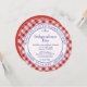 Tu picnic del 4 de julio se sentirá aún más especial con este sencillo diseño patriótico de rojo, blanco y azul. Es un diseño gráfico de una bandera estadounidense ondeando que se muestra en el centro atrás rodeada de cuadros de gingham rojos y blancos. Los detalles están en el centro al frente Con plantillas de texto para que sea fácil rellenar los divertidos detalles para la fiesta del año. La forma circular redonda tiene texto arqueado en la parte superior e inferior. Las plantillas son muy intuitivas y fáciles de personalizar.
