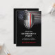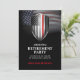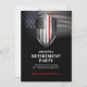 Escudo de línea roja fina en gloriosa bandera americana ondeando sobre un fondo negro. Una elegante plantilla de fiesta de jubilación que es fácil de editar. Este elegante diseño es adecuado para la jubilación o graduación de bomberos.