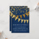 Elegante. Moderno. Con estilo. Glamour discreto con banderas de banderines brillantes en dos tonos de brillo dorado con confeti que cae centelleante y brillante en varios tamaños y tonos de dorado. Un estallido de estrellas brillantes resalta el brillo. Una composición tipográfica muy contemporánea que no es en absoluto tradicional. Es simple y breve. Les dice a sus invitados: "¡Vamos a dar una fiesta y será la fiesta de su vida!". Para la novia y el novio elegantes pero no tradicionales. COLORES: azul cobalto zafiro real oscuro profundo y dorado, brillos dorados. Especialmente adecuado para bodas de otoño o invierno, fiestas de Nochevieja, fiestas de cumpleaños y anuncios de fiestas de aniversario.
