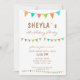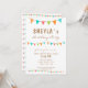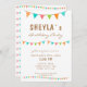 Invitación moderna y colorida a la fiesta de cumpleaños de la bandera. El diseño tiene banderas de fiesta de cumpleaños con colores rojo, azul y verde. El texto es una tipografía moderna - personalice esta invitación de cumpleaños con sus datos y haga su propia tarjeta de cumpleaños. Ideal para niños, niños o chicas y para cualquier otra persona.