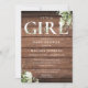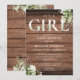 Es una tarjeta de invitación de baby shower de niña con tipografía elegante y hermoso follaje en un fondo de madera rústica. Diseñado por Thisisnotme©