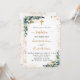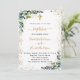 Por el bautismo de dos niños. Un fondo blanco decorado con vegetación eucalipto, hojas doradas y polvo falso purpurina dorado. Personalizar y los nombres de los niños y detalles de la ceremonia. Letras de color negro y dorado. Parte posterior: fondo blanco con polvo purpurina falso dorado.