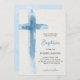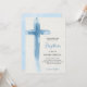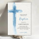 "Baptism invitation card featuring a watercolor blue cross on textured white paper. The front contains details about the baptism ceremony, set in elegant fonts. The overall tone is serene and spiritual."