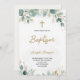 Front of a baptism invitation with elegant typography, featuring a gold cross and green leaves. The tone is serene and celebratory.