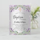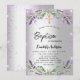Una invitación moderna, elegante y glamurosa para un bautismo que celebra a una niña. Un fondo falso plateado con purpurina falso violeta, chispas, flores de lavanda, flores y vegetación eucalipta. El nombre está escrito con una escritura de estilo con letras a mano moderna. Personalice y agregue sus detalles.