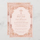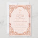 Elegante bautismo de rosa dorado y rosa rubor, invitación al primer cumpleaños con un aire vintage, recomendado para un chica, con un marco de Relieve metalizado dorado (falso) rosa ornamentado con elegantes decoraciones barrocas sobre un fondo rosa oscuro. Por encima del texto hay una cruz religiosa de oro rosa. Todo el texto puede ser personalizado y tiene un color similar al del marco dorado rosa. El marco vintage, ornamentado, se basa en un enlace de portada de libros antiguos franceses, de Georges Mercier (1885-1939) - Madame de Maupin por Theophile Gautier, edición 1911, ahora de dominio público.