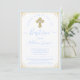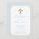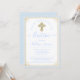 Elegantes invitaciones para el bautismo azul bebé y oro con hermosa cruz de oro en un punto azul bebé y fondo de frontera dorado. Esta invitación al bautismo de niño se personaliza fácilmente para tu evento añadiendo tus detalles. Si lo prefiere, puede retirar la perla azul de la cruz.