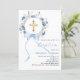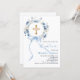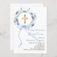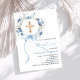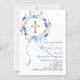 Un elegante fondo blanco, decorado con flores azules de color agua en una corona, un arco azul y una cruz dorada. Personalice y agregue un nombre y detalles.