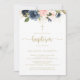 Esta invitación al bautismo de oro floral de color azul marino es perfecta para un bautizo rústico o bautizo. El diseño está decorado con bonitos azules, azules, navales, rosas, ruidosas, doradas y verdes paisajes.