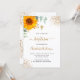 Un fondo blanco decorado con un girasol de color agua, vegetación eucaliptos, hojas doradas y purpurinas de imitación dorada. Personaliza y el nombre de los niños y los detalles de la ceremonia. Letras de color negro y dorado. Neutralidad de género. Parte posterior: fondo blanco con gotas purpurinas falsas doradas