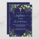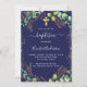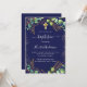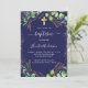 Un fondo azul marino adornado con vegetación eucalipto, hojas doradas y chispas purpurinas de oro falsas. Una cruz dorada. Personalización y nombre del niño y detalles de la ceremonia. Fondo azul marino.