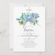 Invitación al bautismo de pavo real de moda boho azul y de leche con elegante tipografía de escritura a mano.