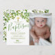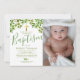Invitaciones para bautismo/bautismo neutro de género con un fondo blanco clásico que se puede cambiar a cualquier color, ramas de árbol acuarelas con frondosos follajes verdes, una cruz de oro religiosa, una foto de tu hijo y una plantilla de texto moderna que es fácil de personalizar.
