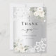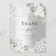 Una tarjeta de agradecimiento moderna y elegante para el bautismo neutral de género. Un fondo falso plateado. Decorado con rosas blancas, flores de flores, encaje y una pequeña cruz. Parte posterior: plantilla para una nota de agradecimiento y un nombre.