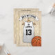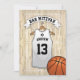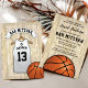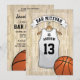 Invitaciones de fiesta de mitzvah informales con un fondo de cancha de baloncesto, una camiseta blanca con el nombre de su hijo, número y la estrella de David. En el reverso están los detalles de la celebración del bar mitzvah con una pelota de baloncesto en la parte inferior.
