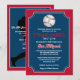 Si su hijo es un entusiasta del béisbol con sueños de las grandes ligas, entonces esta invitación de Bar Mitzvah con forma de boleto en rojo, azul marino y blanco con un gran béisbol blanco y rojo con una Estrella de David azul claro puede ser una forma perfecta de celebrar su gran día. Esta invitación de béisbol tiene el nombre de su hijo impreso en una fuente roja con estilo deportivo con su nombre hebreo en blanco debajo. También hay letras rojas y blancas especiales en una fuente con estilo de liga de béisbol para las palabras "Bar Mitzvah". La parte posterior es roja, azul marino y blanca con una silueta en negro de un bateador balanceando un bate con texto opcional de recepción impreso en blanco encima. Elimine las palabras allí si desea utilizar la tarjeta de recepción coordinada en su lugar.