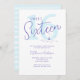 Una elegante y moderna plantilla de 16 años para chicas con temática náutica, con una huella de tinta de las olas del océano, un pequeño barco y gaviotas volando sobre él, caligrafía moderna y rayas en la parte posterior. Una elección muy agradable para una fiesta de 16 años en la playa, una fiesta de cumpleaños en la costa, el lago, el borde del agua, el barco o el yate para un chica que cumple dieciséis años.