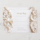 This exquisite wedding invitation and RSVP card set features a sophisticated baroque floral design with intricate ivory and cream-colored patterns on a pristine white background. The elegant script in black and gold adds a touch of timeless class, perfect for a luxurious wedding celebration. The detailed floral motifs create a regal frame around the couple's names and RSVP instructions, making it an ideal choice for those seeking a blend of classic and modern elegance. This set is perfect for upscale weddings, providing a beautiful way to invite and gather responses from your cherished guests.