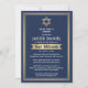 Ya sea que amigos y familia estén practicando el distanciamiento social o que simplemente vivan lejos, conéctense con ellos en línea con una ceremonia y celebración virtual de bar mitzvah. Esta elegante y moderna invitación incluye una redacción para un evento en línea de larga distancia a través de videoconferencia en internet y transmisión en vivo. Todo el texto es sencillo de personalizar, por lo que puede incluir cualquier información relacionada con el servicio, la lectura de Torah y el fiesta. La redacción de la recepción es fácil de personalizar a un desfile de automóviles, fiesta de patio trasero u otro tipo de evento. (IMAGEN PLACEMENT TIP: Una forma sencilla de centrar una foto exactamente como se desea es recortarla antes de subirla al sitio web de Zazzle.) El diseño presenta una estrella de Relieve metalizado de imitación dorada de David, rayas azules y blancas de la marina y una tipografía de estilo Art Déco elegante. ¡Mazel Tov!