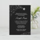 Una invitación a Bat Mitzvah con tema estrella. Con estrellas de tiro de plata falsa sobre fondo negro. Los diseños son ilustraciones/gráficos impresos - NO RELIEVE METALIZADO PLATEADO REAL.