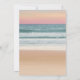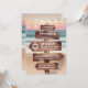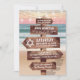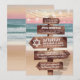 Invitaciones de bat mitzvah con tema del océano que presentan una playa arenosa con puesta de sol exuberante, luces centelleantes y su texto escrito en un letrero de madera rústica.