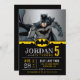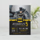 ¡Celebra con estilo heroico con esta invitación de feliz cumpleaños de Batman! Con Batman en acción junto con tipografía audaz inspirada en el grabado de tipografía de pizarra, este diseño dinámico marca el tono perfecto para un fiesta inolvidable. Personalizable total con los detalles de su evento, es ideal para los fans del héroe más grande de Gotham.