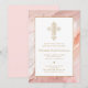 Invite a sus huéspedes con estas invitaciones elegantes, tradicionales y ornamentadas de bautismo de cruz dorada! El diseño presenta una cruz dorada ornamentada y un fondo de pincel de pintura al óleo color rosa de color rosa. Personalizar con sus propios detalles.