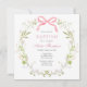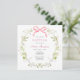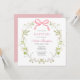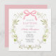 La invitación al bautismo incluye una corona floral de color de agua en primavera adornada con un arco rosa. Personalice su información o haga clic en "Haga clic en el personalizar más adelante" para editar estilos de fuente, tamaño y colores.