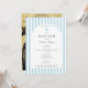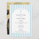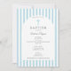 Un hermoso diseño bautista con un arco moderno con una polvorienta cruz azul y fondo rayado y un ícono ortodoxo griego de la Virgen María en el reverso de la tarjeta. Un diseño religioso ideal para la cristalización del bautismo de un niño. En esta colección de diseño se pueden ver la papelería y la decoración coincidentes.