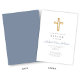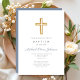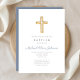Invitación al bautismo de niño con escritura azul y cruz religiosa personalizada.
