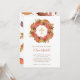 Esta invitación al bautismo de otoño cuenta con una elegante corona de flores de color rojo, marrón y oro y un patrón coordinado de hojas de otoño en la parte posterior. Hay una falsa cruz de oro en el centro de esta carta neutral de género.