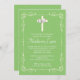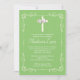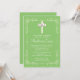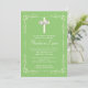 Nuestra hermosa invitación al bautismo cruzado o la invitación al bautizo presenta un elegante marco floral de viñas delicadas que rodea una cruz blanca con un arco de perlas colocado sobre un fondo verde primaveral. Visita nuestra tienda para esta invitación en una amplia selección de colores modernos y modernos y para ver nuestra selección de invitaciones religiosas para un bautismo chica o un bautismo infantil.