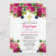 Elegante acuarela de color rosa brillante, magenta, burdeos y azul niña floral Baptismo diseño de invitación con toques de hojas verdes exuberantes y falsas hojas de purpurina de oro en un ramo tipo serpentín que rodea los detalles de tu bebé dulce. Una falsa cruz de trinidad de purpurina de oro se sienta por debajo del patrón floral, y la parte posterior presenta una repetición de la franja floral superior delantera sobre la parte superior e inferior. Este diseño floral compuesto por Holiday Hearts Designs (derechos reservados) está listo para su personalización.