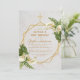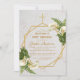 Esta elegante invitación geométrica floral para bautizo y primer cumpleaños recomendada para niña tiene un marco dorado irregular con ramos de flores de calas blancas y helechos arriba y abajo a la izquierda sobre dos hexágonos dorados que se superponen sobre un fondo de mármol blanco, con una cruz dorada en la parte superior. El nombre del niño está escrito en una elegante letra caligráfica. Todo el texto tiene un color amarillo dorado, como el marco dorado.